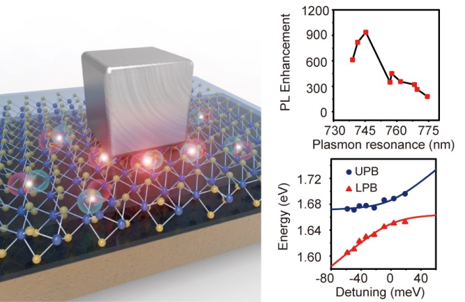 2017年,该团队将银纳米棒作为表面等离激元法布里-珀罗腔与单层二硒化钨结合,利用纳腔的真空场与二硒化钨中的激子之间的强相互作用,实现室温下对激子跃迁的能级调控,即Rabi劈裂(Nano Lett. 2017, 17, 3809-3814)。随后,他们选择具有更高光场局域度的纳腔——由单个银纳米立方与金膜组成的纳米间隙系统,并将单层二硒化钨夹在纳米立方与金膜之间。此时二维量子体系感受到更加局域的光场,因此参与耦合的激子数目也将更少,体系越发趋近于具备量子性。他们利用暗场散射光谱观察到了Rabi劈裂,指出复合体系处于中等强度耦合区间,即能量转移区(能量从等离激元单向地、超快地流向二维激子)。他们观察到二维激子的自发辐射荧光得到了极大的增强,相较于没有银纳米立方的地方,间隙区域中的激子荧光增强达到了近1000倍(图一)。需要指出的是,此时的荧光增强不再是传统的等离激元增强荧光,而是更为广义的Plexciton 增强荧光。研究成果以题为“Light-Emitting Plexciton: Exploiting Plasmon-Exciton Interaction in the Intermediate Coupling Regime”发表在ACS Nano 2018, 12, 10393-10402上。