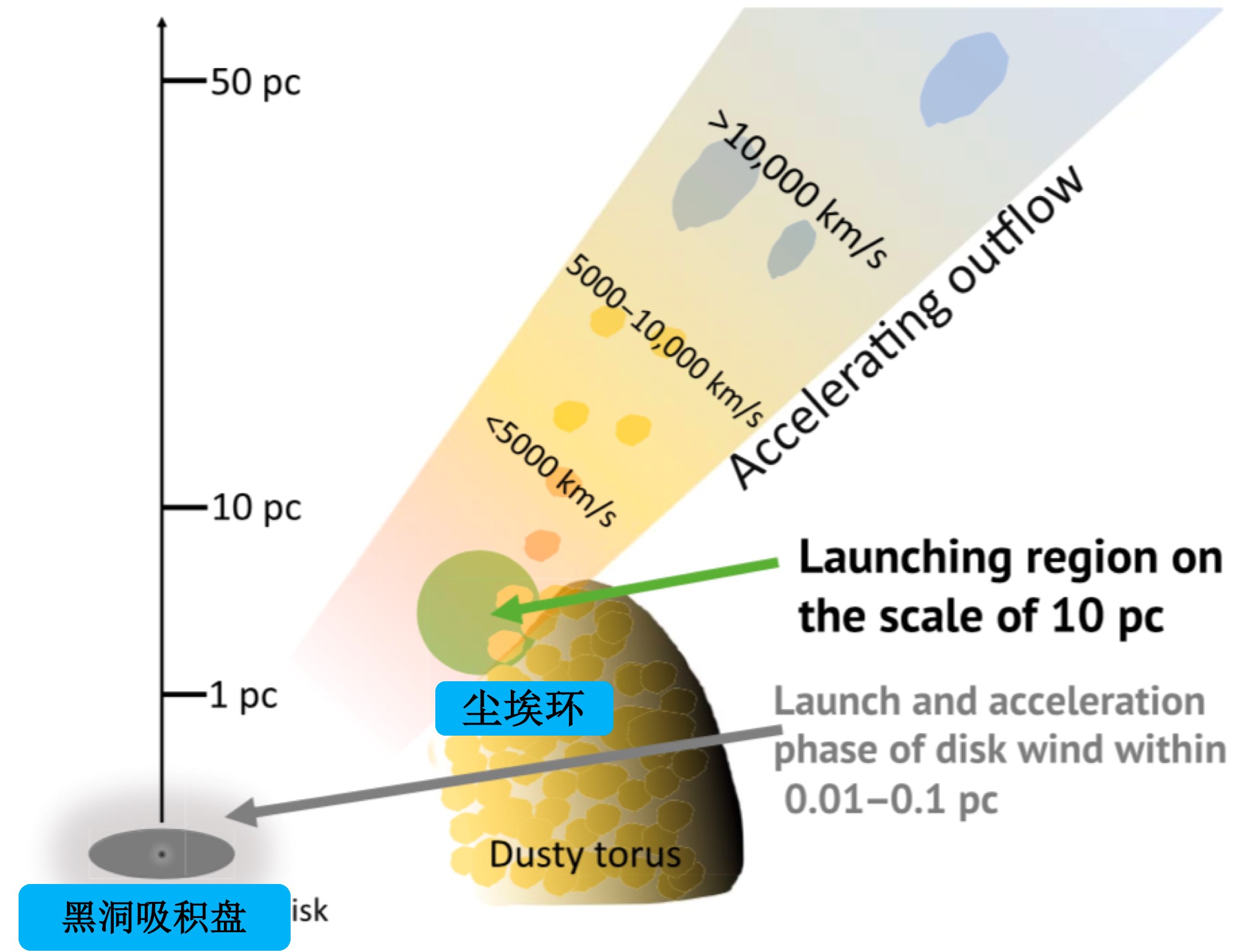 图3 活动星系核高速外流的两种可能起源位置:黑洞吸积盘和尘埃环。二者尺度相差至少两个量级。