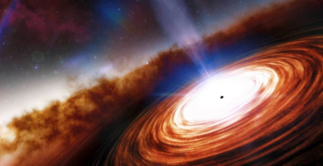 图1 活动星系中心引擎:活跃的巨型黑洞吸积周边物质,形成旋转的吸积盘,产生的强烈电磁辐射可超过其所在星系恒星光度总和的千倍以上,对星系整体演化产生重要影响(图片来源:NOIRLab/NSF/AURA/J. da Silva)。