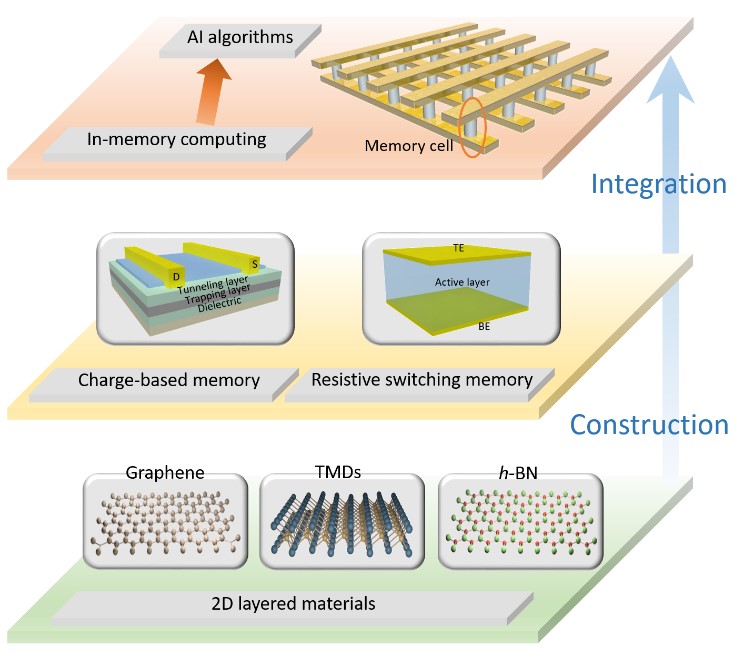 随着以数据为中心的人工智能应用的快速发展,冯·诺伊曼计算架构存算分立的特点给海量数据处理造成了严重的访问延迟和能量损耗。为突破传统的冯·诺依曼计算架构、实现存算一体化,构筑高速、低功耗、可高密度集成的新型多功能存储器是其中尤为关键的研究课题。二维材料因其独特的结构和物理化学性质受到广泛关注,已被应用于构筑各种高性能新型存储器件。何军教授课题组长期从事新型二维存储器件方面的研究,包括基于增强缺陷效应的光电存储器和忆阻晶体管(Nat. Commun. 2019, 10, 4133;Nano Lett. 2020, 20, 4144),以及基于范德华异质结的红外非易失性存储器(Sci. Adv. 2018, 4, eaap7916)等。近期,我院何军教授课题组受邀在国际期刊Advanced Materials(《先进材料》)上在线发表综述文章:Emerging Two-dimensional Memory Devices for In-memory Computing。吃瓜网站
