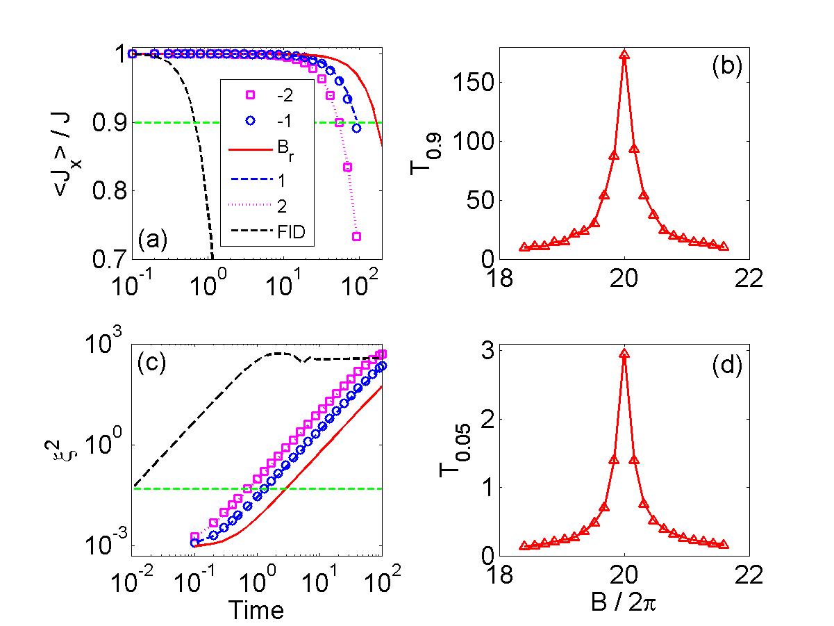 上左图展示单轴动力学解耦的基本过程:(Ⅰ)选定任意初态的量子比特(绿色箭头所示),绕Z轴(外加磁场方向)旋转一周(蓝色圈,磁场大小与演化时间满足魔幻条件);(Ⅱ)利用脉冲使量子比特绕Y轴旋转180度;(Ⅲ)绕Z轴旋转一周(魔幻条件);(Ⅳ)重复步骤(Ⅱ),实现初态的高保真存储。上右图展示抑制经典噪声的效果(旋量玻色-爱因斯坦凝聚体),初态分别是相干态(图a和图b)和压缩态(图c和图d)。