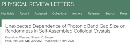 5月17日,Physical Review Letters (《物理评论快报》)在线发表了我院万端端副研究员的最新研究成果。论文题为“Unexpected Dependence of Photonic Band Gap Size on Randomness in Self-Assembled Colloidal Crystals” ( 《自组装胶体晶体中光学能带对随机性的未预期依赖》 )。