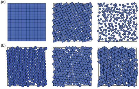 胶体颗粒自组装形成的形态举例。(a)横截面为正方形的颗粒在不同堆积密度下的形态。(b)不同横截面的颗粒在同一堆积密度下的形态。