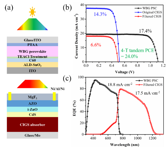 近期,我院方国家教授课题组,与肖旭东教授课题组和嘉兴学院尹新星博士课题组合作,在宽带隙钙钛矿太阳能电池及钙钛矿/铜铟镓硒四端叠层电池研究领域取得新进展。