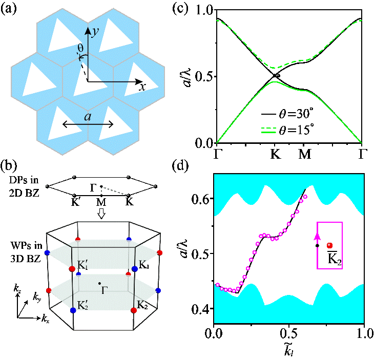 图1:基于外尔路径理解谷拓扑物理。(a)谷声子晶体示意图;(b)合成三维布里渊区及外尔点分布;(c)二维带结构;(d)沿特定外尔路径测量的表面带结构,显示无带隙的手性表面态。