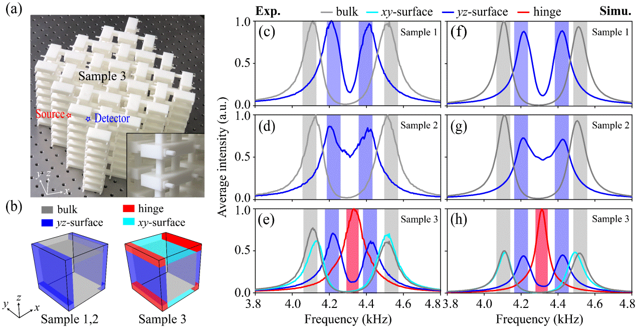 图2三维“面阻碍”高阶拓扑绝缘体的声学实现。(a)实验样品;(b)体、面、棱态的空间分布示意图;(c-e)各空间区域上实验测量的强度谱线,显示“面阻碍”拓扑的完整证据;(f-h)相应数值模拟结果。