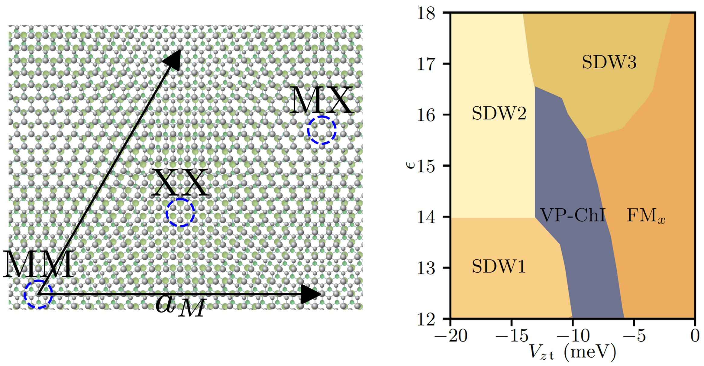 图1 MoTe2/WSe2摩尔超晶格(左图)中,由多体相互作用导致的ν=1量子相图(右图)。