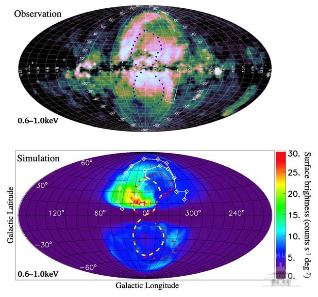 图2:X射线观测的气泡结构(上)与我们数值模拟结果(下)的比较。