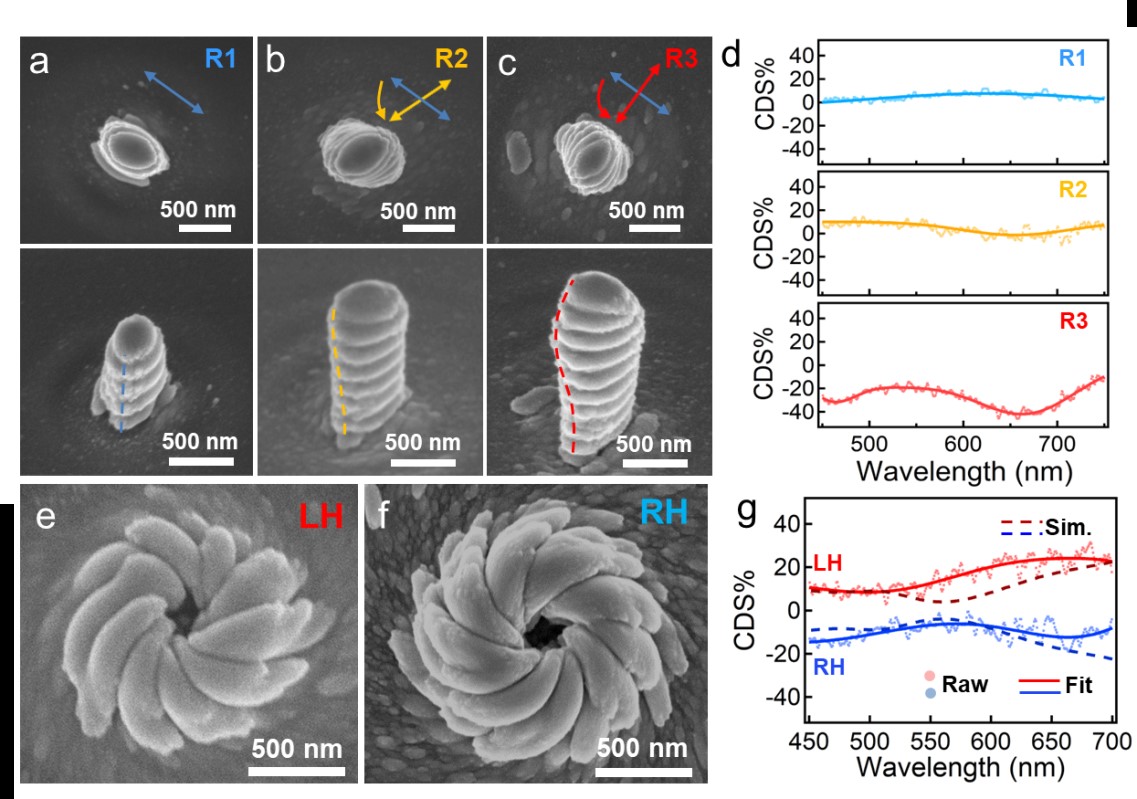 在PNAS论文中(PNAS 2023, 120, e2216627120),他们详细介绍了以PtO为首的几类典型无机半导体材料在偏振偶极诱导下的取向生长过程。在偏振光场作用下,PtO纳米颗粒在动力学上更倾向于取向排列生长,形成椭圆形的柱状结构(图2a)。通过在同一位点多次改变偏振方向可以得到螺旋扭曲的纳米柱结构(图2b, c)。随着螺旋度的增加,其光学手性逐渐加强(图2d)。在矢量偏振光场作用下,PtO纳米颗粒能够组装形成更为复杂的图案(图2e,f),在可见光范围内表现出较宽的手性光谱(图2g)。
