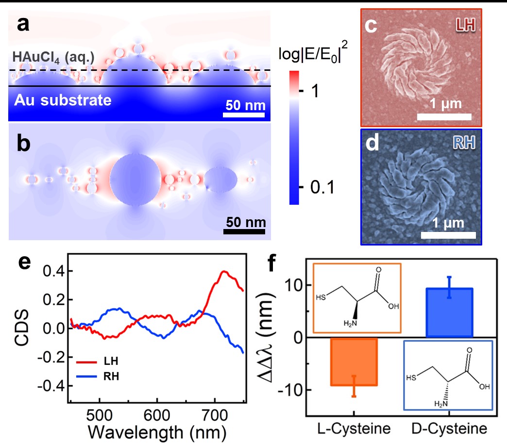 在Nature Communications论文中(Nat. Commun. 2023, 14, 1422),他们主要介绍了以金为代表的等离激元手性超结构。在该体系中,光学近场增强的生长模式对于偏振诱导取向生长起到了关键作用(图3a, b),利用矢量偏振光场也可以得到手性等离激元纳米结构(图3c, d)。这种等离激元手性超结构展现出较强的超手性场和光学活性(图3e),对手性分子展现出较大的光谱不对称因子(图3f),适用于不同手性分子的光学检测。该方法同样适用于多种介质材料手性超结构的可控生长,但是其手性光学强度要比等离激元手性超结构要弱。