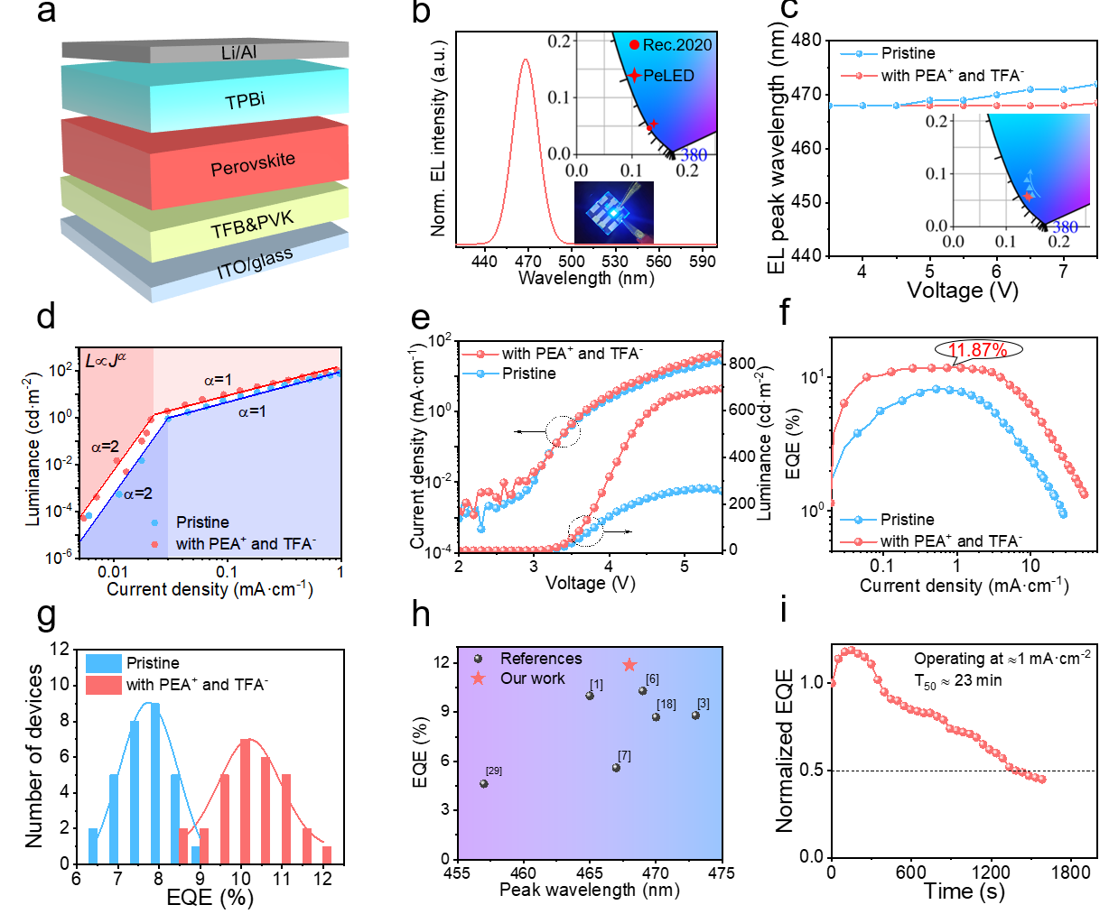 有机无机杂化铅卤钙钛矿在发光方面表现出卓越的性能,三基色中的红光和绿光发射器件的外量子效率已经超过了20%。然而,实现465-475 nm纯蓝光发射的高性能钙钛矿LED仍然是一个巨大的挑战。鉴于此,2023年吃瓜网站 王倜&柯维俊&方国家于AM刊发多功能添加剂策略可实现高效的纯蓝光钙钛矿LED的研究成果。通过在准二维p-F-PEA2Csn−1Pbn(Br, Cl)3n+1钙钛矿多晶薄膜中添加溴化苯乙胺(PEABr)和苯乙胺三氟乙酸盐(PEATFA)优化钙钛矿薄膜,具有更低吸附能的PEA+阳离子的添加能够有效调控多晶钙钛矿薄膜中的低维n值相分布,极大地改善准二维钙钛矿薄膜内的电荷传输;TFA-阴离子中的C=O基团和钙钛矿晶格相互作用钝化表面缺陷从而大大提升了薄膜的荧光量子效率;由于TFA-C=O基团和钙钛矿的结合导致-CF3基团暴露在外侧,在钙钛矿薄膜外层形成了一层具有明显指向性的偶极子,从而抬升了薄膜的费米能级,降低了器件工作过程中电子注入势垒。因此,优化后的器件在 468 nm处表现出11.87%的最大外量子效率,并具有稳定的光谱输出,这是迄今为止报道的纯蓝光钙钛矿LED的最高值。除量子点方式制备蓝光钙钛矿LED以外,这项研究为制备高效纯蓝光LED提供了新的思路和解决方案。