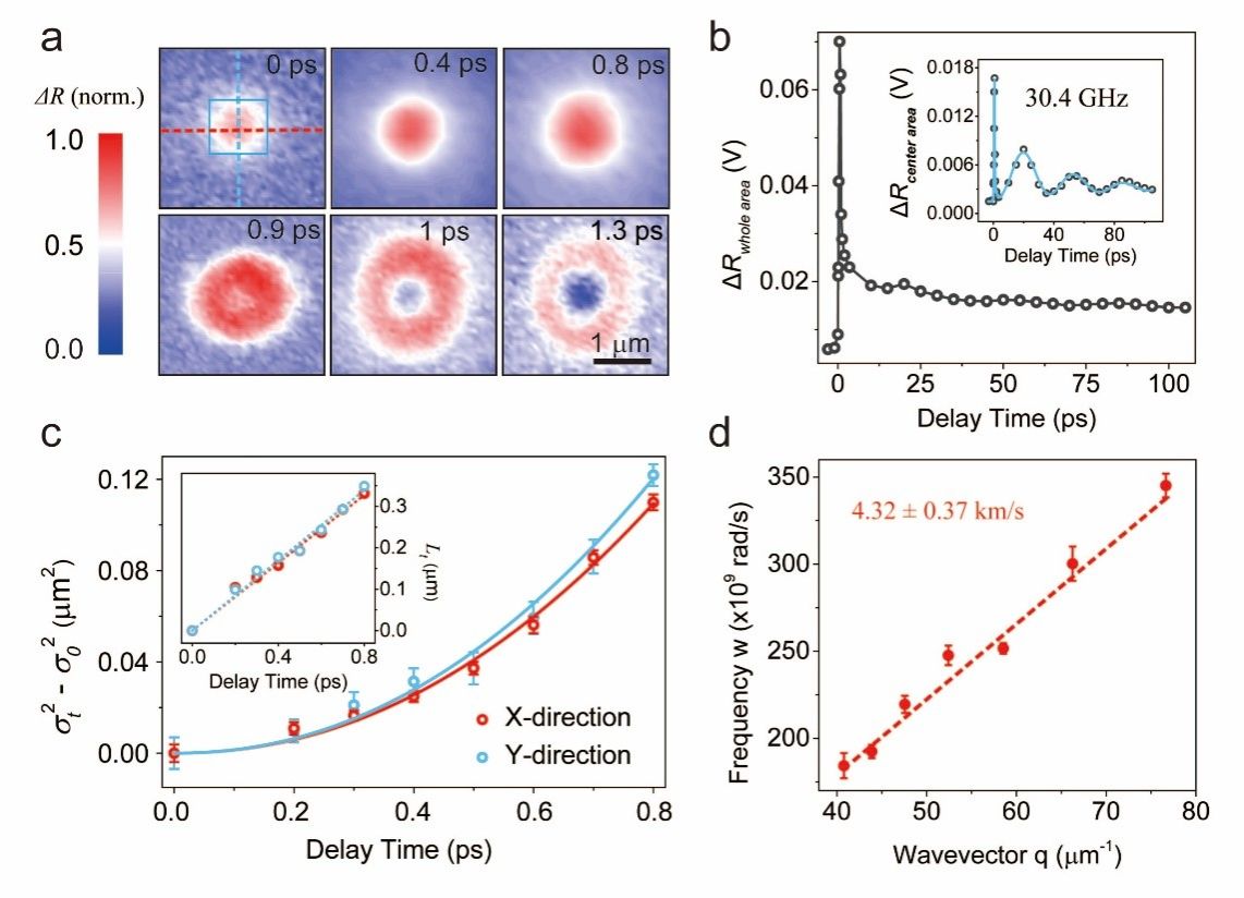 在该工作中,通过瞬态吸收显微镜技术,对多铁材料BiFeO3中光生载流子的输运进行时间和空间分辨的直接成像。实验表明,BiFeO3的热载流子可以与声子进行耦合,从而在1 ps时间内产生弹道输运和甜甜圈形状的载流子空间分布,其弹道输运长度约为340 nm。此外,该工作通过测量声子的色散曲线和计算相结合,确认了与载流子耦合的声子模式为沿着[111]方向极化的纵向声学声子。该工作通过瞬态吸收显微镜技术和超快光谱学相结合,系统的研究了多铁材料的热载流子弛豫和输运的动力学过程,对后续基于多铁材料的电子功能器件的设计和优化具有重要的指导意义。该研究得到了国家重点研发计划的基金资助。