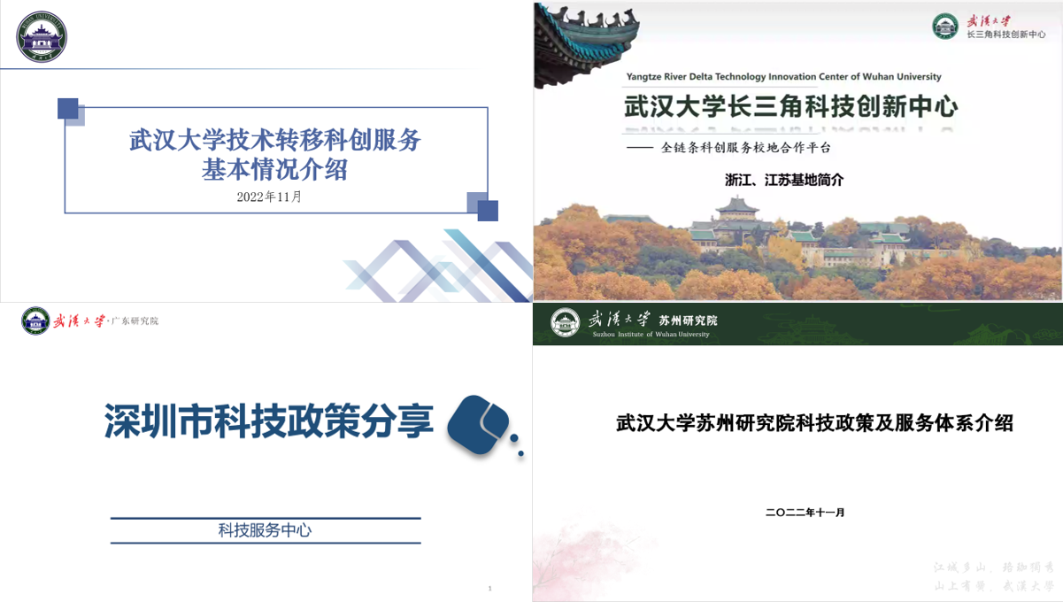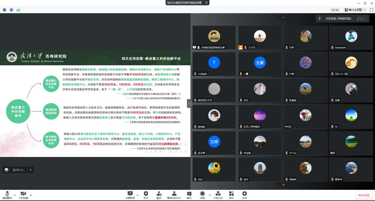 王建彤副总经理就学校关于技术转移与成果转化的总体情况进行了详细解读,具体内容包括学校技术转移中心机构变迁、学校在成果转化方面的实践探索和相关成功案例介绍。孟虹兆主任介绍了学校全链条科创服务校地合作平台——吃瓜网站 长三角科技创新中心,重点介绍了学校浙江、江苏基地。任盛主任对深圳市和广东省科技政策进行了解读,包括深圳市科技计划体系、承接国家重大科技项目管理办法及广东省基金项目资助体系等。王丽副主任重点解读了苏州科技创新环境、高校来苏州科技创新支持政策、苏州研究院科技工作服务体系及光子产业项目征集。