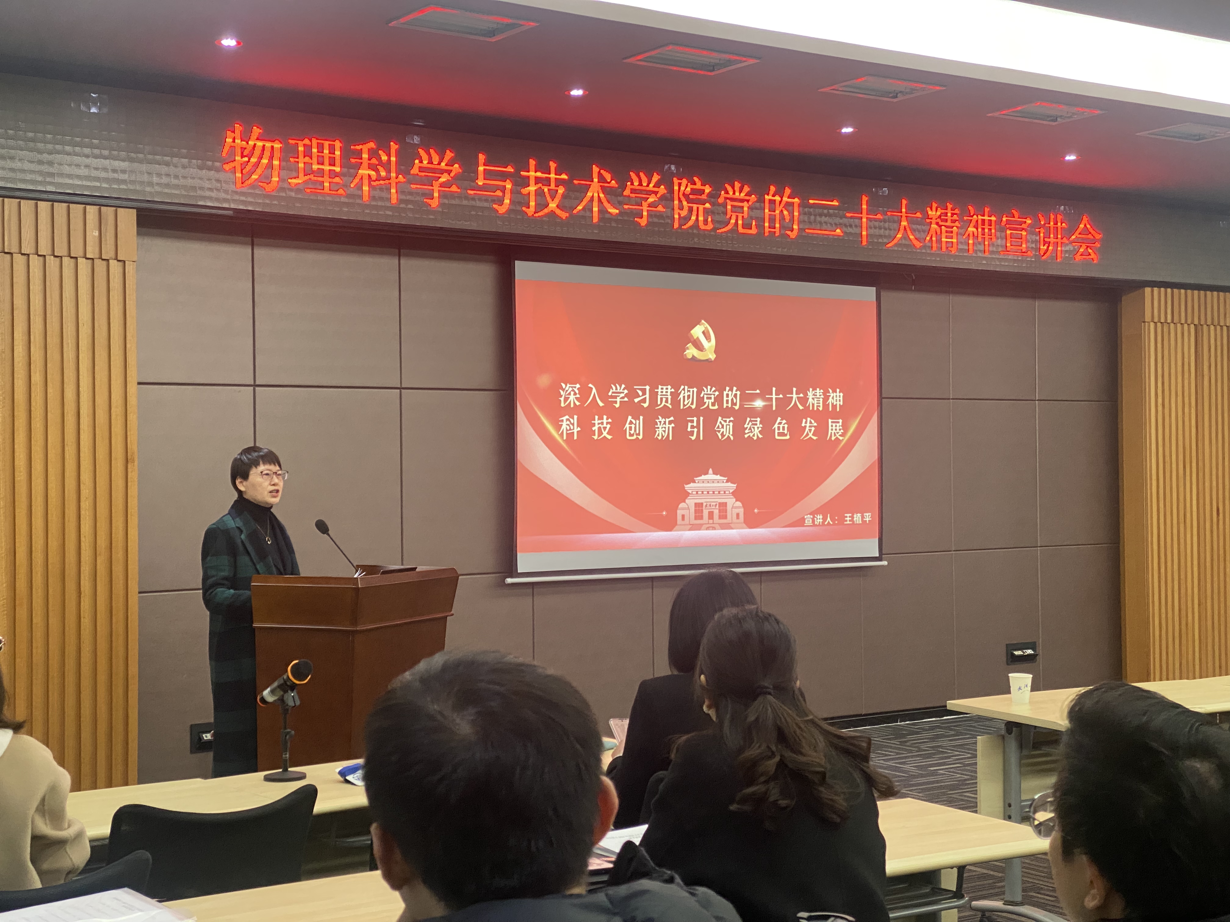 王植平教授做了题为《深入学习贯彻党的二十大精神科技创新引领绿色发展》的宣讲报告。他从深刻认识党的二十大的主题、主要成果,完整准确全面领会党的二十大精神,科技创新引领绿色发展三个方面进行了解读。他表示,党中央以前瞻性的时代眼光,强调教育、科技、人才是全面建设社会主义现代化国家的基础性、战略性支撑,把党对当代科技生产力发展和现代化建设规律的认识提升到了新的高度;现代化建设需要青年的力量,报告中专门用一整段话对全党抓好青年工作给予鲜明强调、提出明确要求,对青年一代给予热情鼓励、给予殷切希望,充分体现了党对青年和青年工作的高度重视、亲切关怀,为新时代中国青年成长成才指明了方向。