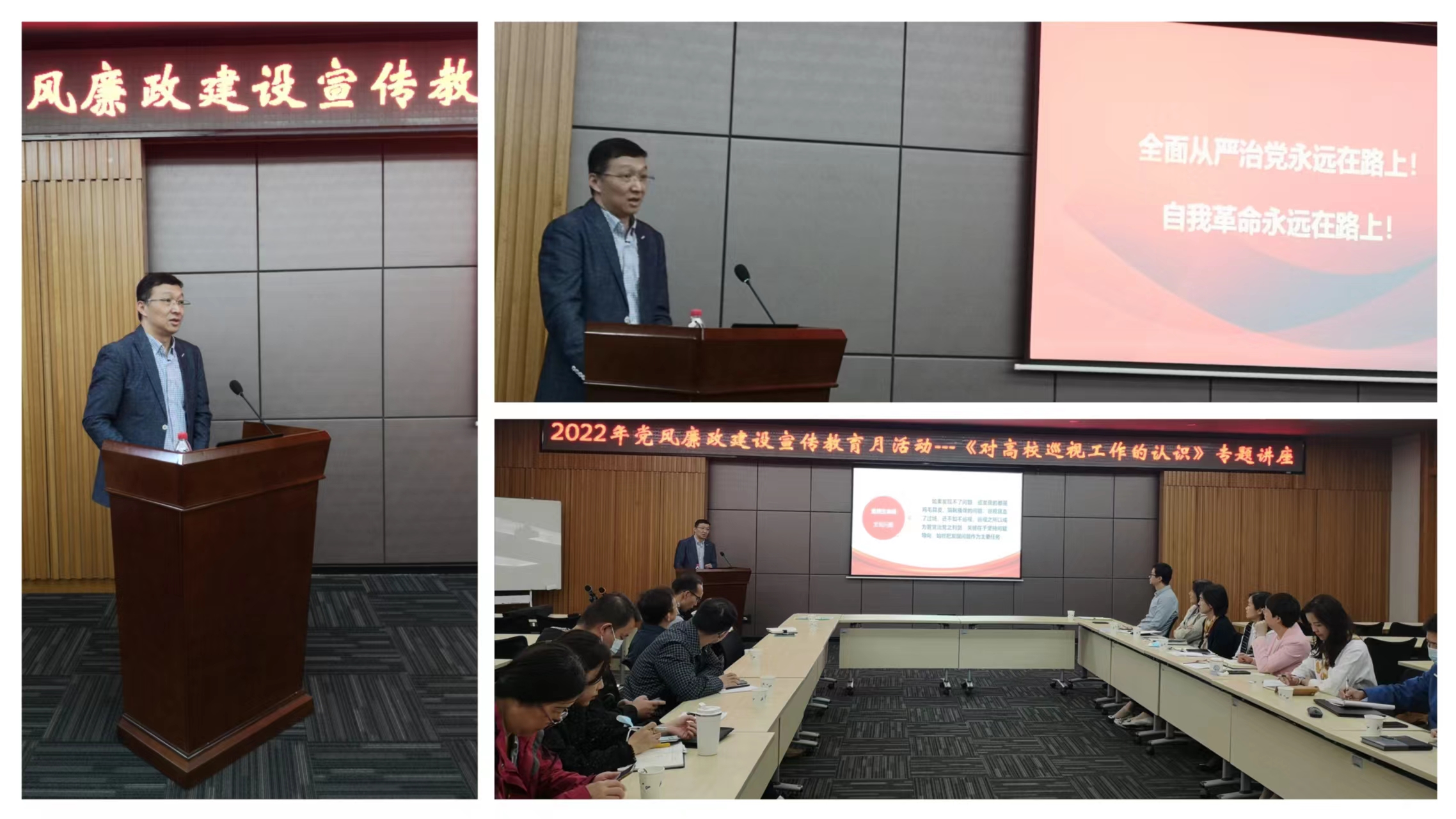 蒋明主任从开展巡视的内涵和意义、巡视发现的问题、巡视取得的成效等三个方面,全面阐释了什么是巡视、巡视与巡察的区别、高校开展巡视工作的意义等内容;结合学校8轮内部巡视工作中发现“四个落实”方面问题的典型案例,强调了通过巡视发现问题、推动解决问题,发挥以巡促改、以巡促建、以巡促治的强大作用;通过近年学校巡视工作开展的实际情况,与大家分享了学校在构建良好政治生态、提升办学治校水平、增强师生幸福感获得感和锻造高素质干部队伍等方面取得的显著成效。
