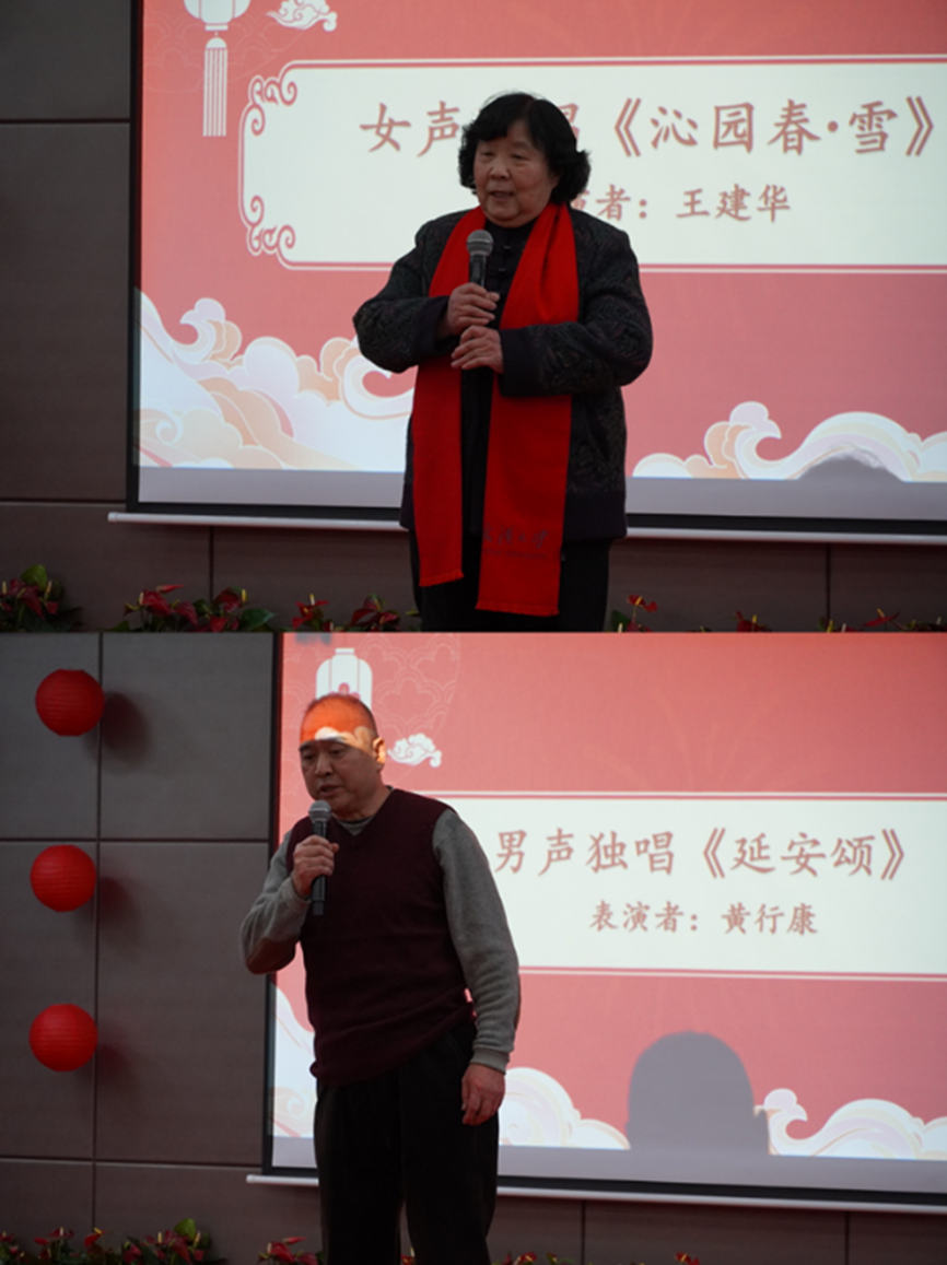 离退休老教师王建华带来的《沁园春·雪》气势恢宏,激昂的旋律仿佛将人们带回了那个战火纷飞的年代。黄行康老师的男声独唱《延安颂》则气势磅礴,唱出了对革命圣地的敬仰和对革命精神的传承,赢得了阵阵掌声。