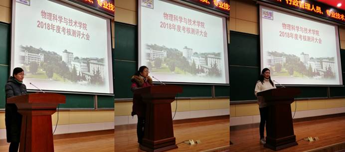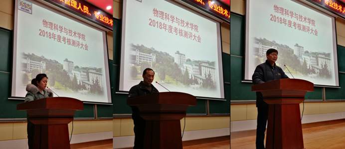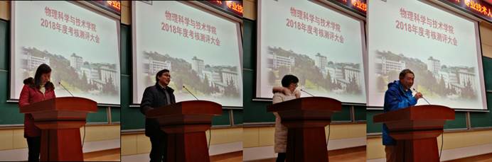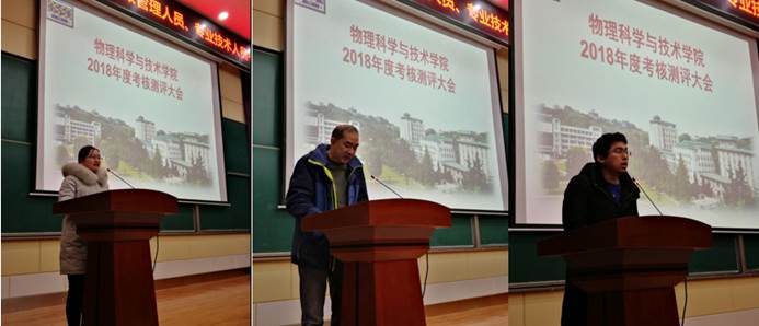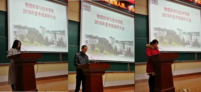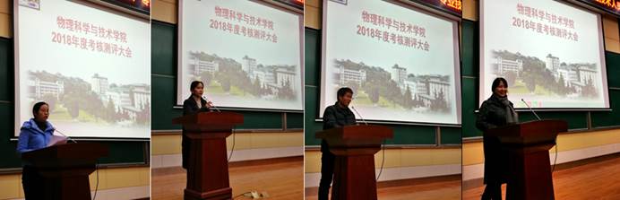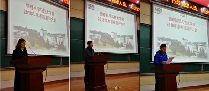 辅导员工作考核民主测评、团干考核测评与本考核同场进行,区分对象、一次述职、分表打分。考核大会分为三个阶段,第一阶段是专职辅导员暨团干考核,以辅导员岗位职责为基本依据,全面评价辅导员的履职表现和工作业绩,切实加强辅导员队伍建设。学院四位专职辅导员依次从思想理论教育和价值引领、党团和班级建设、学风建设和科技实践、学生日常事务管理、心理健康教育、网络思想政治教育、校园危机事件应对、职业规划与就业创业指导、理论和实践研究等方面进行了工作汇报。随后,学院办公室的其他9位行政管理人员分别进行了大会第二阶段的述职报告,结合自身的岗位职责,对2018年度的整体工作进行了全面回顾与总结。大会第三阶段,学院实验系列的13位专业技术人员也进行了工作汇报,分别汇报了物理实验教学的总体情况和大型仪器设备的管理使用情况等。