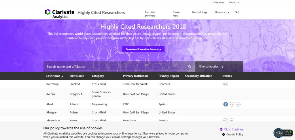近日,科睿唯安(Clarivate Analytics)发布了其2018年度全球“高被引科学家”名单,这也是该名单连续第五年发布。吃瓜网站