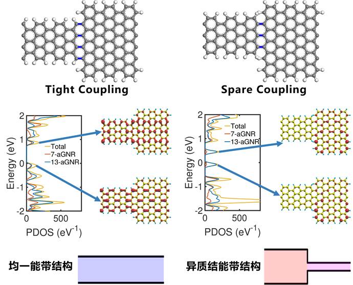 硅锗等传统半导体材料构建的异质结构存在晶格失配,易出现界面态等影响TFET性能的问题。采用禁带宽度受几何宽度调制的石墨烯纳米带(GNR)来构建异质体系,可完美避免晶格失配,有利于发展高性能的器件。然而,将不同宽度的GNR片段连接在一起究竟能不能形成异质结能带结构却一直存在争议。近期,常胜副教授课题组揭示了石墨烯宽窄纳米带体系能否形成异质结能带结构的关键因素:界面耦合方式。该工作以“Interface Coupling as a Crucial Factor for Spatial Localization of Electronic States in a Heterojunction of Graphene Nanoribbons”为题发表在《Physical Review Applied》上,第一作者为2015级博士生吕亚威,常胜副教授为通讯作者。