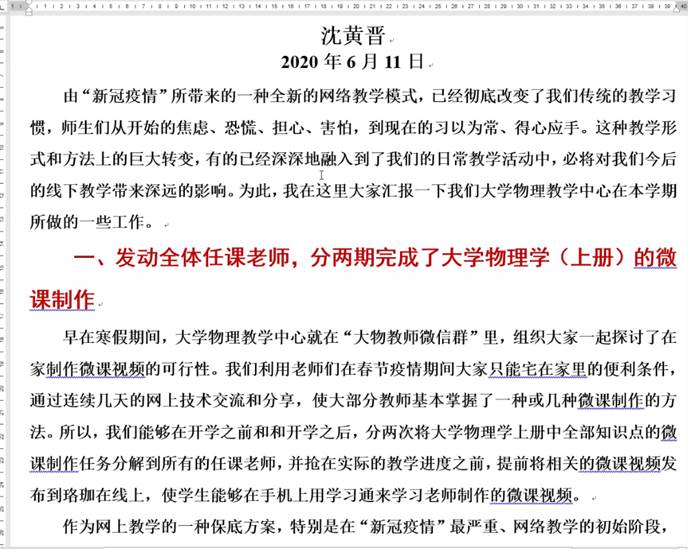 沈黄晋老师介绍了大学物理全体老师克服疫情带来的重重困难,团结一心,分工合作共同制作微课, 并在珞珈在线上创建MOOC课头,探索在珞珈在线上进行网络考试的新模式。