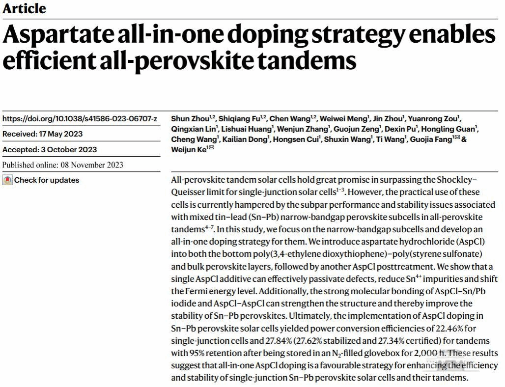 柯维俊、方国家教授团队关于全钙钛矿叠层太阳能电池的最新研究成果。论文题目为“Aspartate all-in-one doping strategy enables efficient all-perovskite tandems”(《天冬氨酸盐一体化掺杂策略实现高效全钙钛矿叠层电池》)。