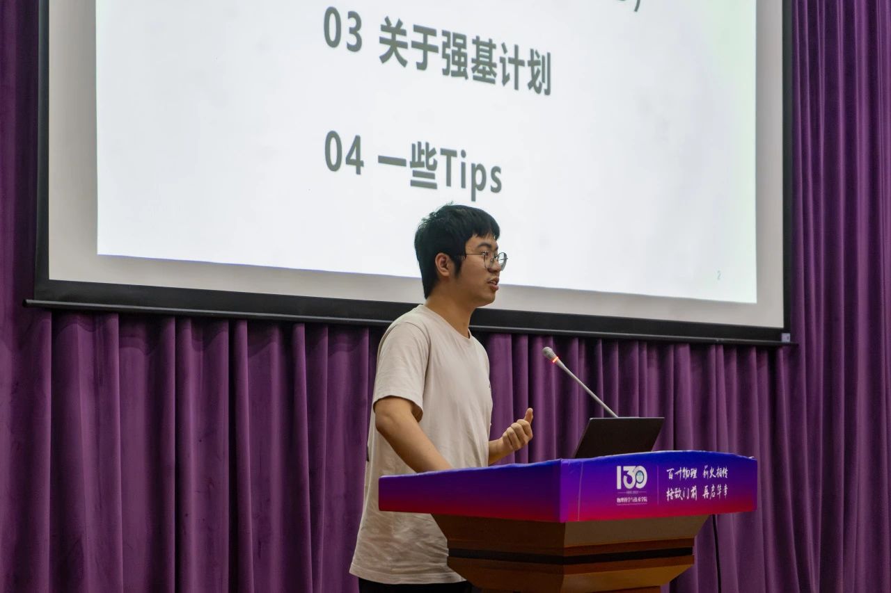 楼同学为我们综合介绍了学习兴趣的寻找、留学申请的准备、强基计划的解读以及学习小贴士几个方面的内容。关于兴趣,他告诉我们要走出自己的路,发掘自己的内驱力,不盲从,可以通过课程、科研、与书籍寻找自己兴趣所在。关于留学,他鼓励同学从大二开始做好准备,准备好语言考试,积累研究经历,最好可以在大三进行暑期研究以获得相关推荐信。另外,他提醒强基的同学不因政策松弛学业,勉励同学们努力进取。最后,楼同学提出了几点小贴士,提醒同学们完善自己的知识体系,培养自学能力,并学会用网络文献解决学习上的问题。