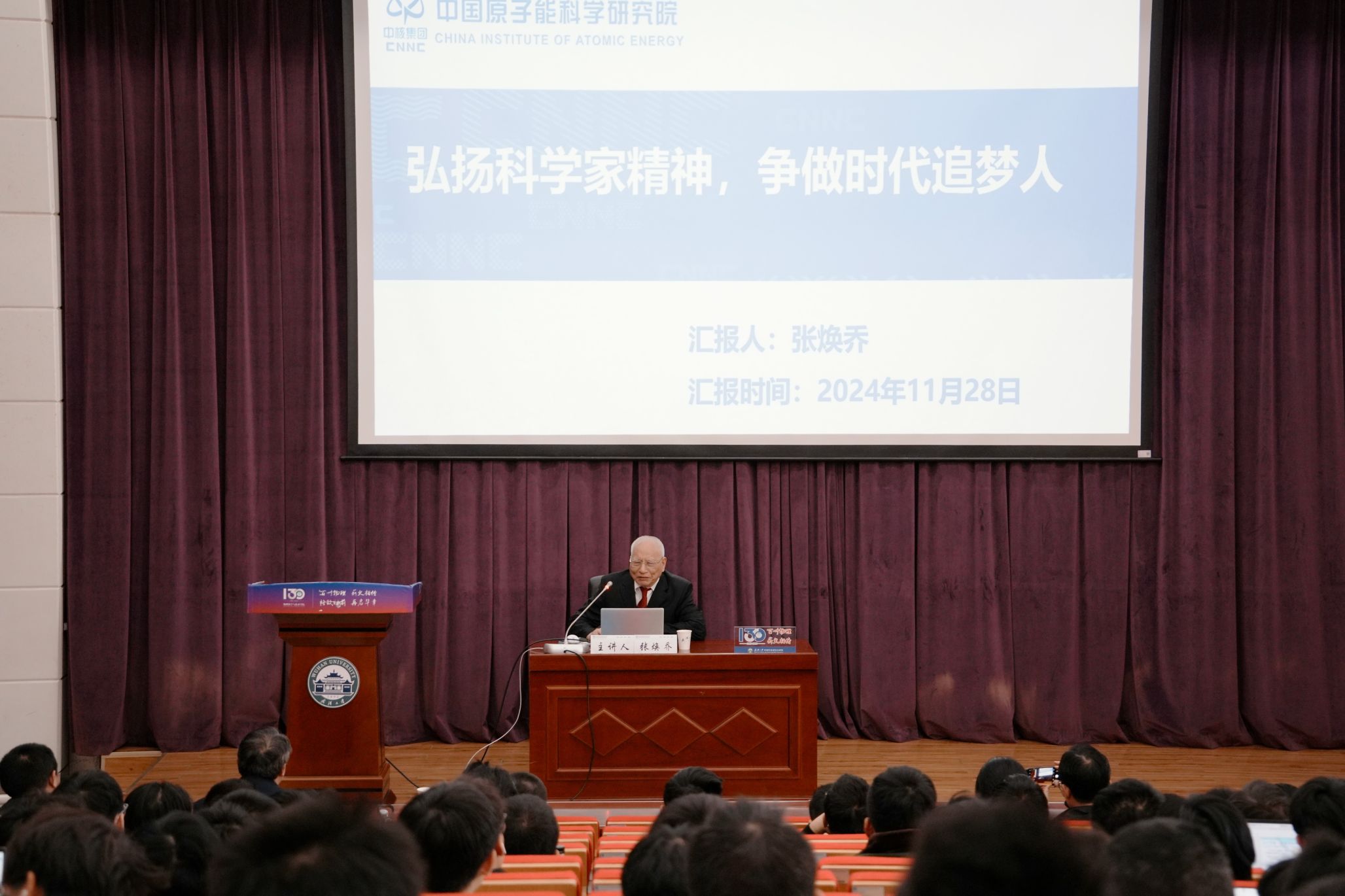 谈及“国之栋梁,吾辈楷模”,张焕乔院士向同学介绍了中国原子能科学研究院,被称为核工业发祥地、老母鸡、核科研基地,造就了60多位两院院士,在获得“两弹一星”功勋、奖章的23位科技专家中,有7位在原子能院创建功勋。