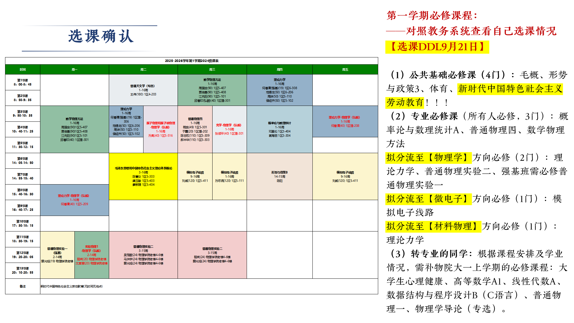 学业管理是本次大会的重点内容之一。彭老师强调各位同学每学期必须进行一次学分清查,并详细列出了第二、三学期培养方案中的必修课程清单,提醒同学们对照教务系统仔细核查个人课程修读情况,避免遗漏。同时彭老师也结合相关统计数据详细介绍了2024-2025学年第二学期学院学业情况,分析了2024级各班GPA分布及专业课挂科情况,为同学后续重修补考等做出规划意见和指导。针对本学期即将到来的专业分流,学院计划陆续组织开展物理学、微电子科学与工程、材料物理三个专业方向的详细介绍会,帮助同学们结合自身兴趣、学业表现和职业规划,做出科学、理性的选择。
