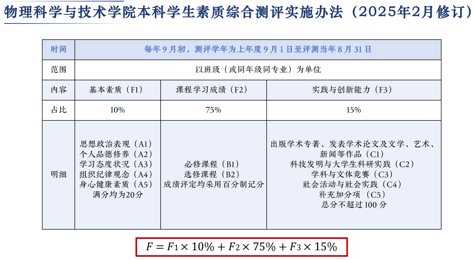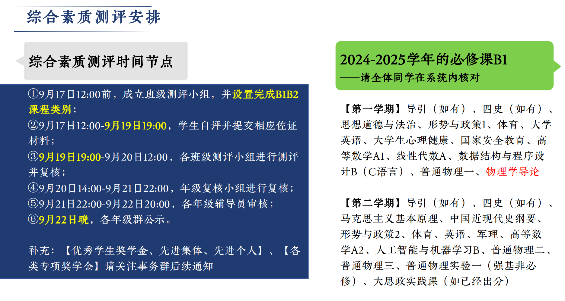 会议对2025年2月修订的《本科学生素质综合测评实施办法》进行了详细解读,包括测评时间、内容构成、评分细则等,并明确了各类竞赛、科研成果、社会活动等的加分标准,彭老师还对年级综合素质测评做出了相关工作节点安排。会议鼓励同学们积极参与各类实践活动及班团活动,全面提升自身综合素质。