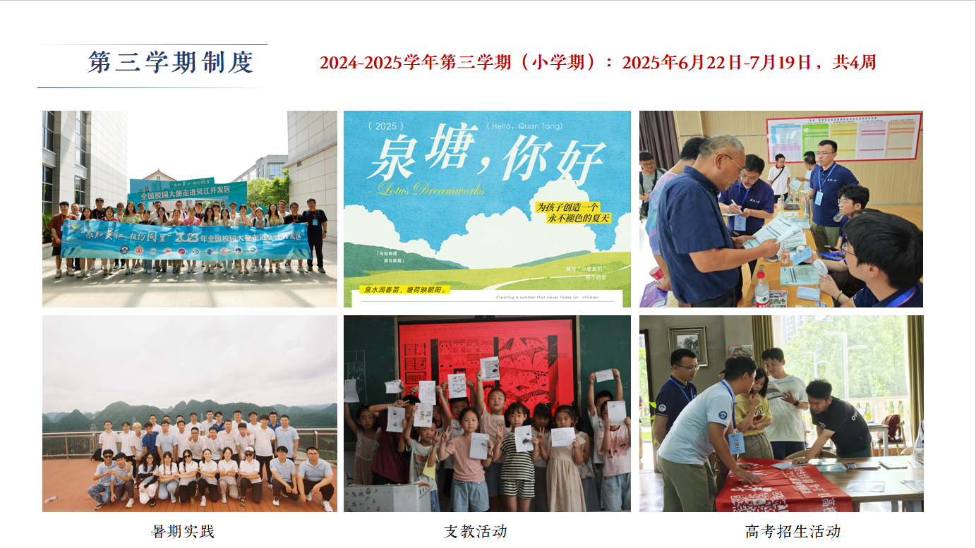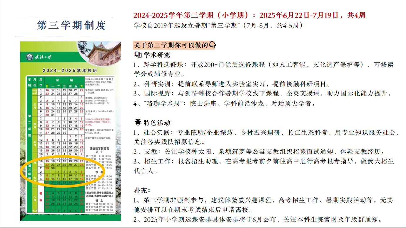 彭瑾老师重点介绍了学校“第三学期”制度及规划,2024-2025学年第三学期时间为6月22日至7月19日,为期四周。期间,学校将开放多门优质选修课程,涵盖人工智能、文化遗产保护等多个领域,供学生跨学科选修。同时,科研实训、暑期学校国际视野拓展、学术交流报告、社会实践、暑期支教及高考招生等活动也将同步开展,为同学们提供丰富的学术资源和实践机会。