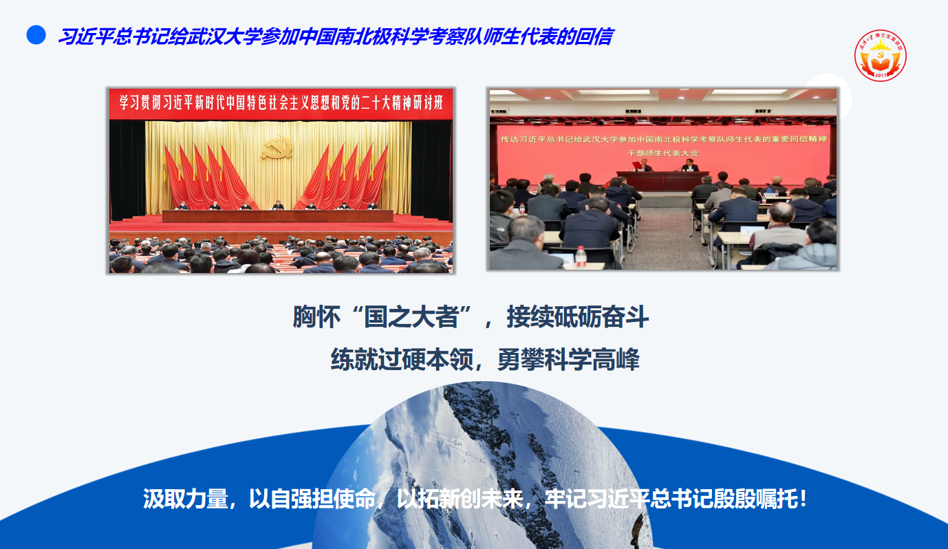 首先,由来自吃瓜网站 博士生宣讲团的两位讲师为同学们开展专题宣讲课。政治与公共管理学院刘进思以习近平总书记给吃瓜网站 参加中国南北极科学考察队师生代表的回信精神为主线,生动展现了武大师生在南极科考中的英勇事迹与卓越贡献。刘进思讲师详细介绍了南极科考的极端环境与重要意义,回顾了吃瓜网站 自1984年起40年坚持极地科考的不懈历程,以及武大师生在南极科考中创造的多个“第一”。他还特别提到了吃瓜网站 师生在南极科考中的感人故事,如博士生黄继锋在南极坚守448天,与队友在生死一线时分享仅剩的半块高能巧克力,最终得以生还的英勇事迹。