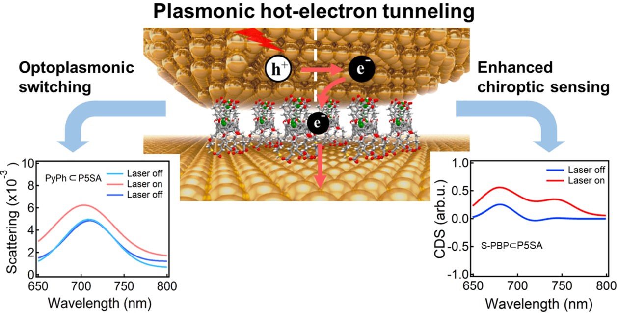 丁涛课题组在前期研究基础上开创了基于寡聚酰胺折叠体超分子量子等离激元体系(Sci. Adv. 2022, 8, eabj9752),发现了量子隧穿效应对分子手性具有额外的光学手性放大作用,并在单个手性分子层面实现了手性光学信号的传感与探测(Nat. Commun. 2024, 15, 2)。但是这类折叠体分子较为特殊,其空腔较小,对于其它手性分子的光学探测不具有普适性。为此,他们与高等研究院陈世贵、王璐课题组合作,利用柱芳烃(P5SA)的刚性结构以及合适的空腔大小(Angew. Chem. 2023, 135, e202216987),构建了金颗粒在金膜上(NPoM)的超分子等离激元复合结构。他们发现这种超分子空腔在等离激元纳腔中的结构一方面能够有效地通过主客体作用实现空腔电导率的调制,从而实现等离激元的光电调控;另一方面柱芳烃也可以控制客体分子的偶极方向实现分子手性的传递与放大,有望在单分子层面检测不同种类的手性客体分子。由于该超分子体系对纳米空腔电导率的调节作用,光激发下的等离激元热电子转移使得客体分子的手性得到传递和放大,不对称因子可高达0.5,这些优异的手性传感和调控性能为先进手性光学器件的开发打下了重要基础。