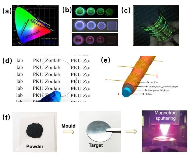 Figure1 (a)可通过驱动电压大小和极性调控的彩色发光器件;(b)超高效率光源体结构;(c)柔性发光器件;(d)纤维光伏电池;(e)纤维忆阻器件;(f)固相合成钙钛矿材料及磁控溅射钙钛矿薄膜