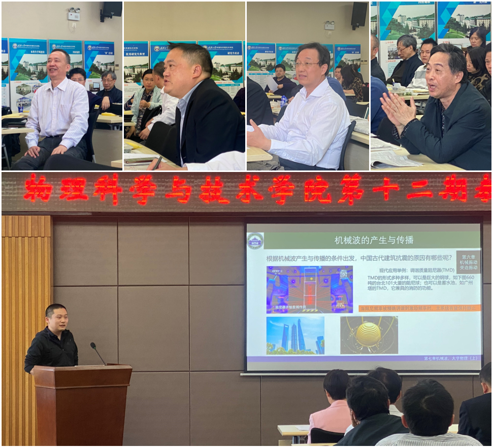 材料系主任晏宁教授进行了《大学物理》第七章《机械波》的讲课示范。潘春旭教授、乔豪学教授、桑建平教授、祁宁教授等教学督导和专家,结合晏宁教授的授课示范,与大家分享了在讲课过程中的仪容仪表、内容组织、呈现形式、讲课技巧、课堂互动等环节的注意事项。与会老师就物理类课程的教学技能进行了热烈的讨论和交流。