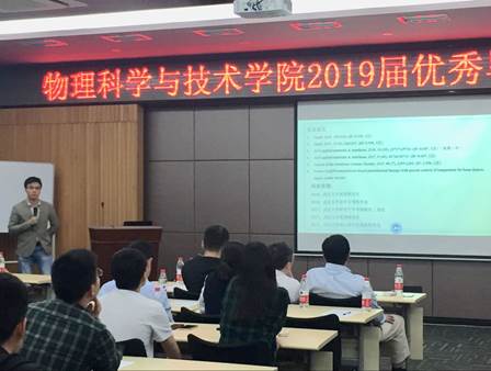 新楼五楼多功能厅举行2019届优秀毕业研究生评选展示活动。本次评选活动邀请到学院副院长陈志权教授、院长助理任峰教授、物理系副系主任蔡浩教授、党委副书记张一飞老师、学院学工办主任李顺彦老师,以及学生兼职辅导员龙云翔老师。本次活动由物理硕士一班王慧杰同学主持。