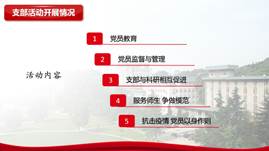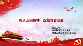 物理二支部在风采展示环节,通过丰富多彩的支部活动,从多个方面展示了模范支部应有的姿态。党员教育形式多样、党内监督严格有序、科研学习积极交流、支部成员争做模范、战疫有我以身作则……精彩的展示得到了在线师生的一致好评。紧接着,物理二支部书记唐庆航给大家讲了主题为“传承五四精神  绽放青春色彩”的微党课,从“五四精神”的现代解读到疫情下的青年榜样,每一张幻灯片都让大家感受到了青春奋斗的朴实真理——“青春由磨砺而出彩,人生因奋斗而升华”。