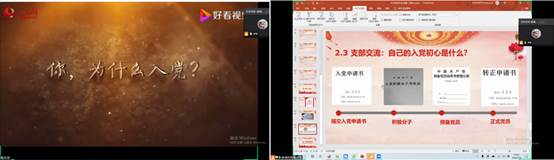 为帮助同学们回忆自己的入党过程,接下来支部同学一起观看视频《你,为什么入党?》。看完视频,支部同学深受启发,主要围绕以下几个方面发言:自己当初为什么要入党?现在有了哪些新的认识?并对照党章发现自己的不足。