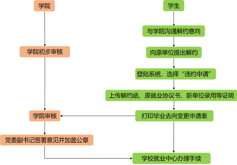与院系、原签约单位沟通,三方均同意后,方可提出违约申请:a. 毕业生取得原签约单位同意解除协议的书面公函并退回原签订的就业协议书(一式四联);b. 毕业生在信息门户—就业中心—个人中心中提交去向变更申请,填写个人违约原因、原签约单位及新拟签约单位名称等信息,导出打印《毕业去向变更申请表》,并将原签约单位同意解除协议的书面公函(解约函)、原三方协议书(一式四联)和新拟签约单位的接收函纸质版交至学院A-212办公室,由学院审核;c. 学院审核通过后(就业系统可查看审核状态) ,辅导员联系毕业生到学院A-212办公室领取审核材料;d. 毕业生持原单位的解约函、新单位的接收函和学院已签章的《毕业去向变更申请表》到就业中心审核并通过后,毕业生方可重新与新的用人单位进行网上签约。流程示意图如下:
