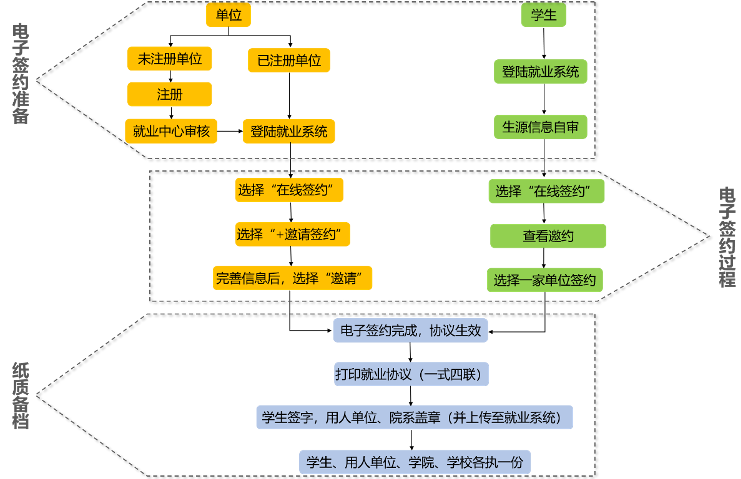 学生就业指导与服务中心主页“注册”、“发邀约”;(2)毕业生“接受邀约”;(3)打印就业协议书(一式四联),协议书需要本人签字、用人单位盖章、学院盖章(学院A-212办公室)。已签章的就业协议书由学校就业中心、用人单位、学院和毕业生各执一份。并将已签章的就业协议书及时上传系统并通过学院审核。流程示意图如下: